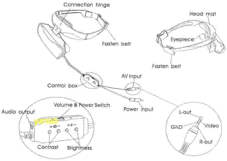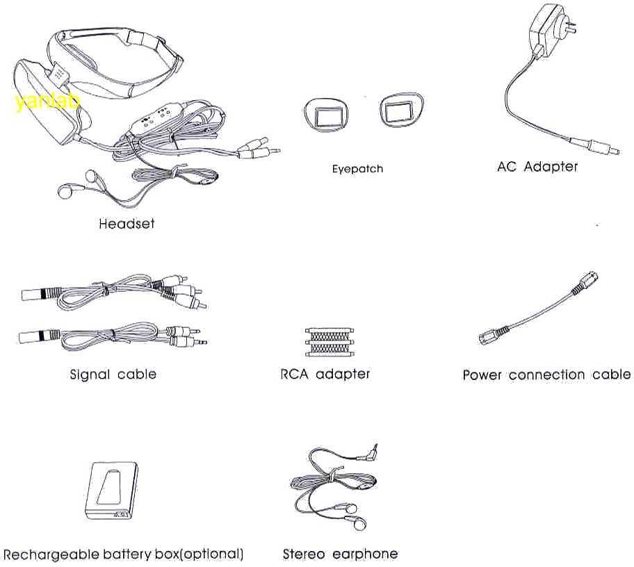Eye-patch, one (1) AC/DC Power Adapter, three (3) AV/Power Cables, one (1) RCA AV