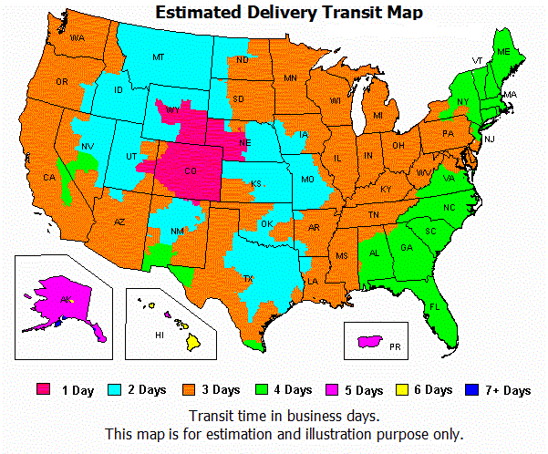 A: For all in stock products, your orders are shipped out the next business day after full cleared payment is received. If the product you ordered is out of stock, you will be notified the next business day after we receive your payment. Based on your location, please find the standard shipping estimated delivery transmit time in the Estimated Delivery Transit Map (for 48 lower states only). For other locations, international shipping, and Insured/Tracked/Air/Priority/Express shipping's, please contact us. We are not able to ship your order out on the same business day because our shipping carrier's pick up truck comes in the morning, so please do not ask.